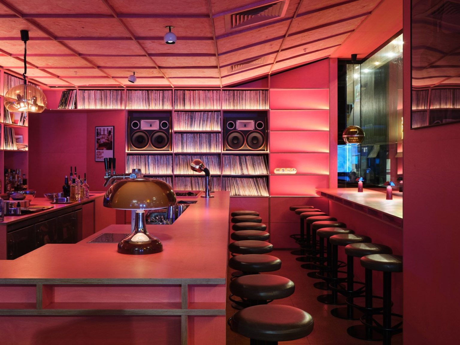Quán bar rộng 80m2 với 45 chỗ ngồi, trưng bày 15.000 đĩa than. Kiến trúc sư đã tận dụng cửa sổ kính lớn nhìn ra đường chính từ công trình cửa hàng bán lẻ trước đó. Mặc dù diện tích không quá rộng rãi, nhưng anh vẫn có thể tạo tạo ra các khu vực chuyên biệt xung quanh quầy bar trung tâm.