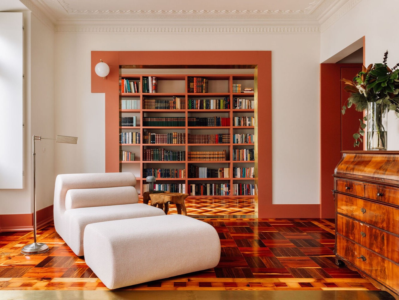 Để tạo ra sự đồng nhất cho toàn bộ căn hộ, đội ngũ cải tạo chỉ sử dụng duy nhật một loại vật liệu đá vôi Lioz và một màu đất nung Terracotta. Điều này mang lại một bản sắc mới mẻ cho ngôi nhà trong khi vẫn giữ được vẻ đẹp của lịch sử.