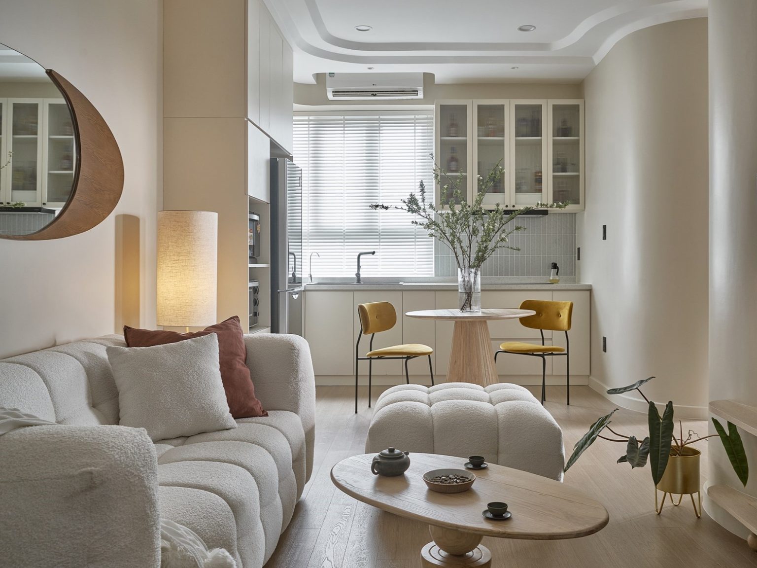 Để tối ưu hoá công năng của căn hộ 74m2 và đáp ứng nhu cầu của gia chủ, đội ngũ thiết kế đã sử dụng thiết kế mở cho phòng khách và bếp nhằm tận dụng tốt nhất ánh sáng tự nhiên, đồng thời kiến tạo một không gian tiện nghi và đa năng. Việc sử dụng các đường cong trong không gian cũng có tác dụng dẫn dắt ánh nắng xuyên suốt căn phòng, kết hợp cùng gương trang trí cùng đèn đứng để tạo nên hiệu ứng đưa mắt người nhìn bao quát một cách tự nhiên nhất.
