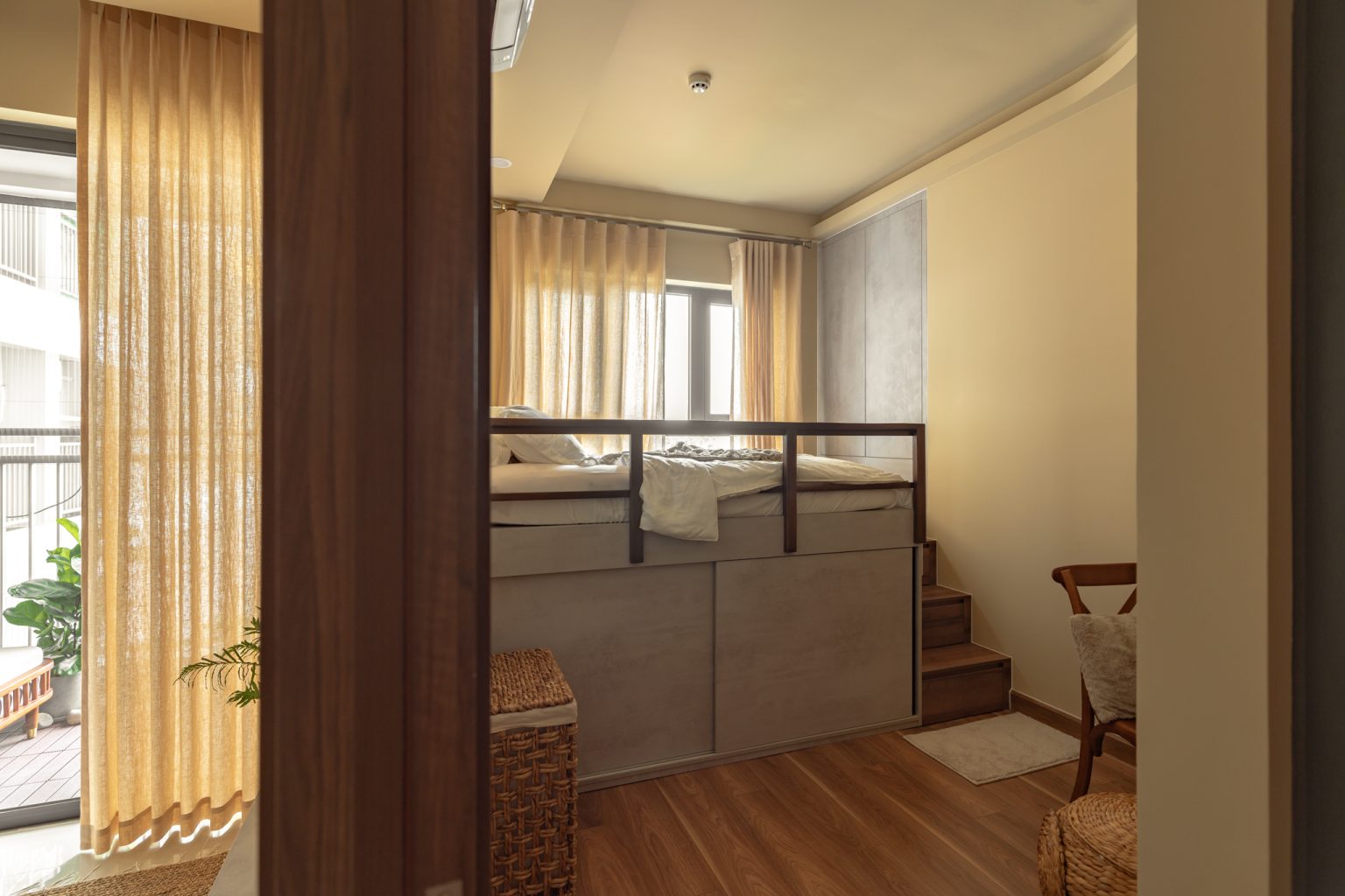 Vốn là hai phòng ngủ nhưng kiến trúc sư đã phân chia công năng cho từng không gian là ngủ nghỉ và làm việc. Tuy nhiên, mỗi phòng đều được trang bị chỗ ngủ. Ở phòng ngủ chính, anh cho đặt nệm đôi kích thước tiêu chuẩn của giường Queen Size với phần giường được nâng cao lên đến 110cm để tận dụng làm tủ cửa lùa, đồng thời nâng tầm nhìn lên cao so với cửa sổ để có thể thấy khung cảnh bên ngoài chung cư. Phòng còn lại được bố trí một giường hai tầng dành cho người thân, bạn bè đến thăm nhà có thể ở lại dài ngày.