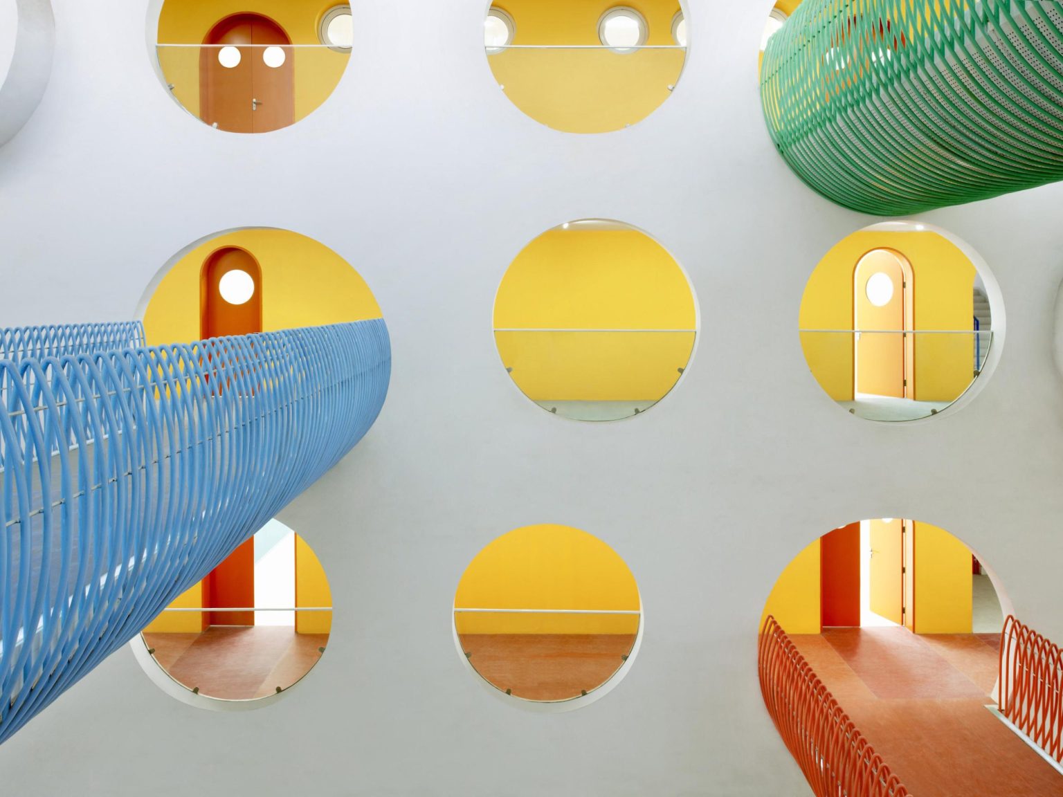 Điểm nổi bật của trường học là mỗi khối nhà và mỗi tầng mang một màu sắc khác nhau, tạo nên 32 khu vực riêng biệt với sự kết hợp đa dạng. Điều này làm tăng thêm sự đa dạng và tạo bản sắc riêng cho kiến trúc của trường. Motif các ô cửa hình tròn được bố trí xuyên suốt từ các cửa sổ lớn bên ngoài, tường hành lang bên trong cho đến cửa sổ nhỏ của từng lớp họp.