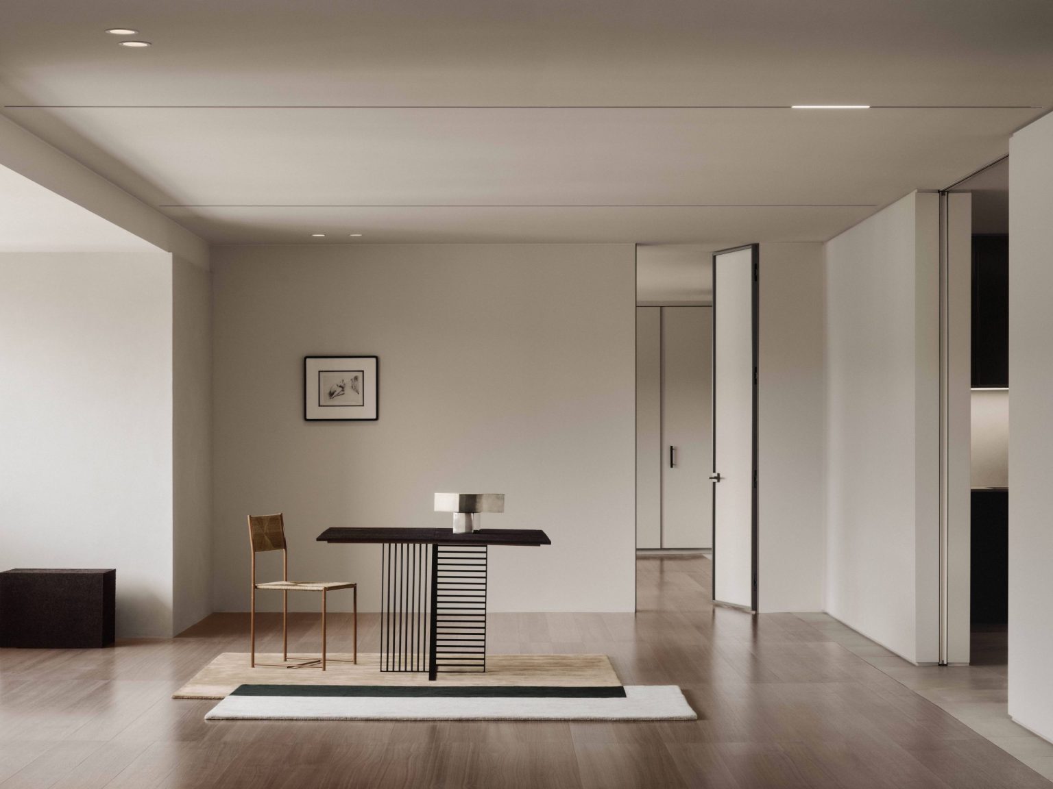 Điểm khác biệt giữa căn hộ so với sảnh tòa nhà nằm ở sự chuyển đổi tinh tế của vật liệu trên tường và sàn để phục vụ cho những mục đích sử dụng khác nhau. Chẳng hạn, một bức tường trục phủ vữa vôi đã được xây dựng để linh hoạt chuyển đổi không gian căn hộ thành hai phần riêng lẻ khi cần thiết hoặc xoay thành một thể thống nhất khi tồn tại nhu cầu sinh hoạt chung. Sự hiện diện của bức tường cũng dẫn đến sự thay đổi trong vật liệu sàn, thay vì sử dụng gạch lát truyền thống, sàn phòng khách đã được lát bằng các ván gỗ vuông, mang lại sự trôi chảy và ấm cúng cho một diện tích tương đối rộng lớn.