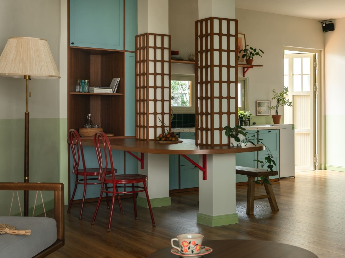 Phòng ngủ sử dụng hệ kính lửng, che rèm linen đóng mở linh hoạt, cửa lùa tiết kiệm không gian, ngôn ngữ thiết kế trên khung cửa được đồng bộ với hoạ tiết trên cột bếp.