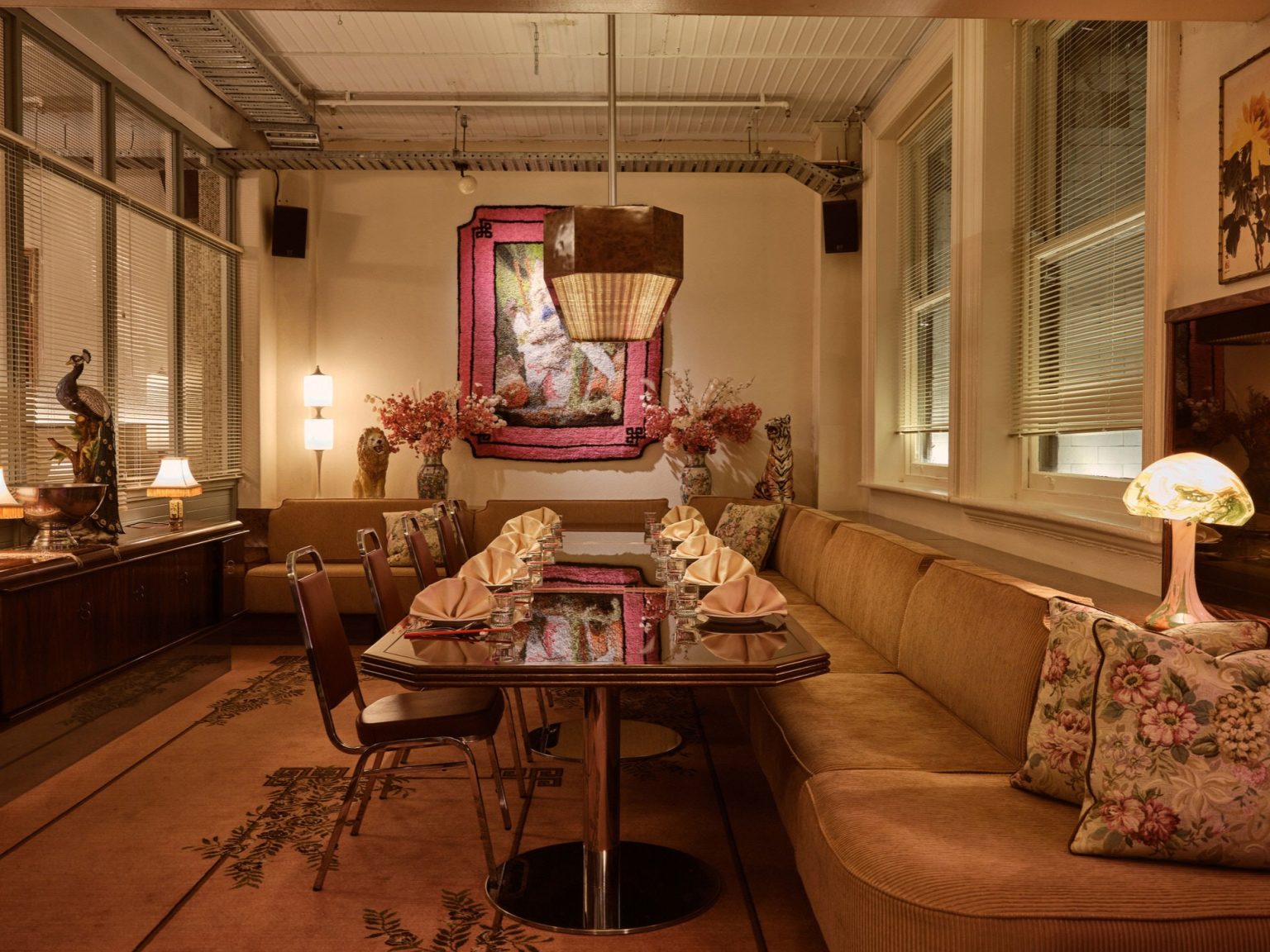 Đội ngũ thiết kế vừa gìn giữ những di sản sẵn có, vừa thêm thắt những yếu tố mới lạ và hiện đại nhưng vẫn dựa trên tinh thần cổ điển. Tại lối vào, biển hiệu neon Good Luck nổi bật chào đón thực khách tại ô cửa sổ phong cách Trung Hoa xưa thông với nhà bếp. Mặt bằng dần dần mở ra một loạt các không gian có sức hút riêng được kết nối với nhau. Quầy bar cocktail được chiếu sáng bằng đèn neon đỏ, khu phòng ăn riêng và bán riêng được nhấn nhá bằng tranh tứ quý, tranh thuỷ mặc và tượng gốm. Đồ gỗ sang trọng từ thập niên 70 kết hợp với những chiếc ghế ăn bọc vải hoa vintage.