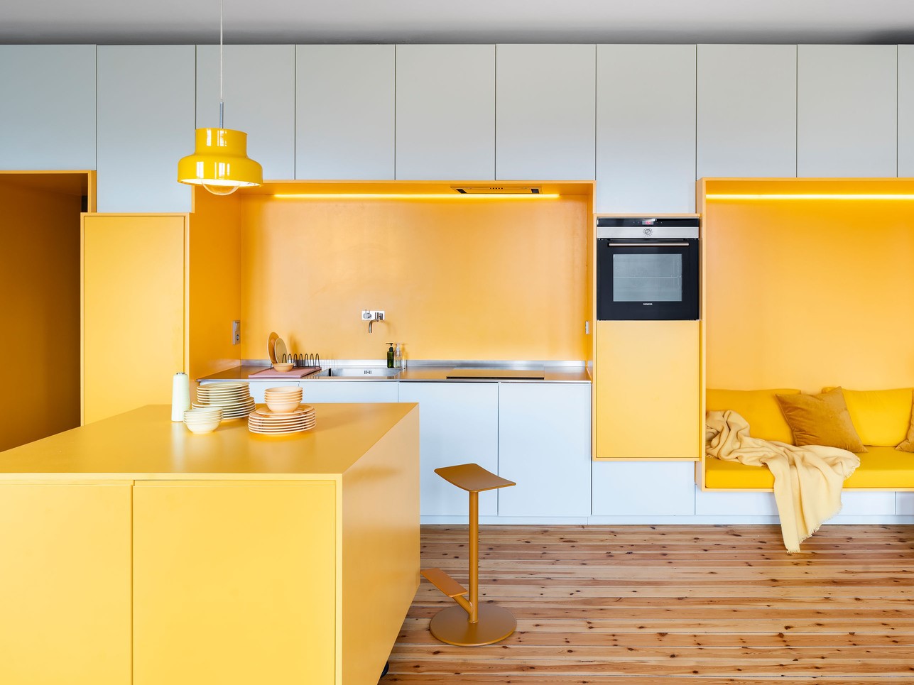 Ở nơi thành thị đông đúc, không gian sống ngày càng trở nên chật hẹp. Bố cục căn hộ thường gồm nhiều yếu tố kiến trúc chồng chéo lên nhau để tối đa hóa tiện ích trong không gian hạn chế, trong đó, nhà bếp thường được giấu đi hoặc kết hợp với các khu vực sinh hoạt khác. Thông qua việc sử dụng màu sắc một cách khéo léo và sống động, ngay cả những khu vực nhỏ như chỗ nấu nướng cũng có thể mang đến cảm giác rộng rãi, hấp dẫn, mang tinh thần rộng mở và truyền cảm hứng sáng tạo.