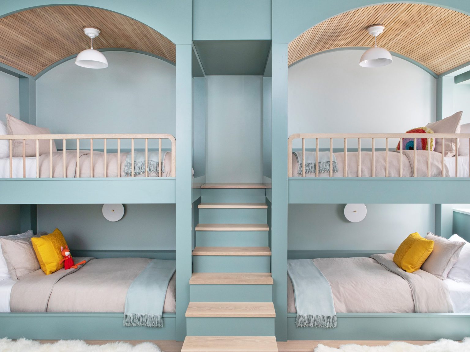 Chiếc giường tầng mộc mạc đến từ nhà WRJ Design được chế tác bằng gỗ chắc chắn, kết hợp những chiếc thang kim loại hiệu ứng mài mòn bổ sung nét công nghiệp hiện đại, cân bằng lại sự ấm áp hữu cơ của gỗ. Việc trang bị thêm rèm che kẻ ô vuông màu xanh lam – một loại họa tiết truyền thống có khả năng tạo nên hiệu ứng thị giác độc đáo, vừa giúp đảm bảo trải nghiệm riêng tư, vừa tăng thêm sự thú vị cho không gian.