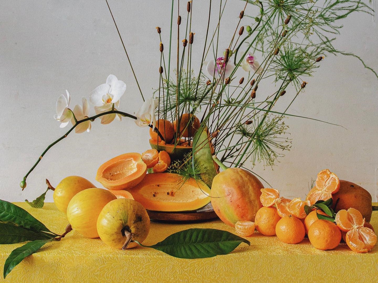 Một sáng tạo ngẫu hứng của florist Lee Juang Ming với trái dư thừa, được xuất hiện nhiều trên các mâm cúng và set trang trí ngày Tết của người Việt.