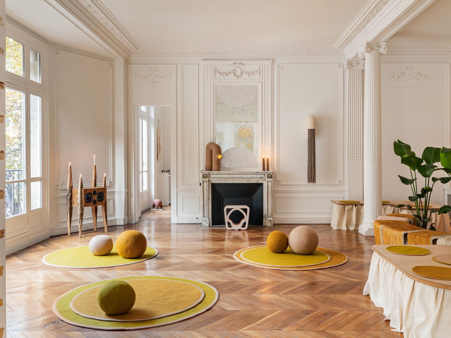 Không gian “Salon de la Lune” mang đến một không gian yên tĩnh nhưng gợi suy ngẫm, thấm đẫm năng lượng nữ tính và nhịp điệu của thiên nhiên. Nền tảng của không gian là những chiếc gối tựa tròn và những tấm thảm tròn bằng len dạ của Muskhane, được làm thủ công bởi các nghệ nhân địa phương ở Nepal. Nghệ nhân gốm sứ Elisa Uberti đã thêm một chiều kích xúc giác với những chiếc đèn sàn bằng đá gốm có viền bằng len merino, cũng như những chiếc ghế đẩu in 3D của Hors Studio – văn phòng chuyên tạo ra các vật liệu sinh học từ chất thải. Được làm từ Leatherstone (da tái chế và chất kết dính tự nhiên) hợp tác với bold design, những chiếc ghế đẩu này phục vụ mục đích thực tế trong các cuộc họp và buổi nói chuyện. Ngoài ra, một chiếc loa phóng thanh thủ công của Timothée Musset được làm bằng gỗ cổ xưa trong các tòa nhà lịch sử đang được trùng tu, càng nâng cao sự hài hòa của căn phòng, mang đến một kết nối mang tính tâm linh với âm nhạc.
