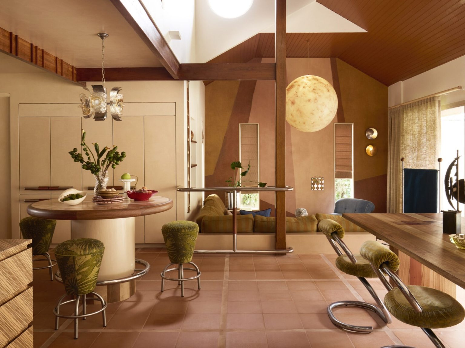 Điểm nổi bật của công trình cải tạo nằm ở sự tính toán tỉ mỉ trong từng chi tiết, từ những đường ron dày ôm lấy các viên gạch terracotta cho đến những tay nắm cong mềm mại trên tủ và cửa, tất cả tạo nên một không gian có chiều sâu với đa dạng kết cấu. Cụ thể, khu vực phòng khách được thiết kế theo phong cách sunken lounge (phòng khách chìm) đặc trưng của thập niên 70 với bộ sofa bọc vải màu vàng sa mạc và xanh denim, kết hợp cùng những đường kẻ sọc rộng tạo cảm giác vui tươi, sinh động.