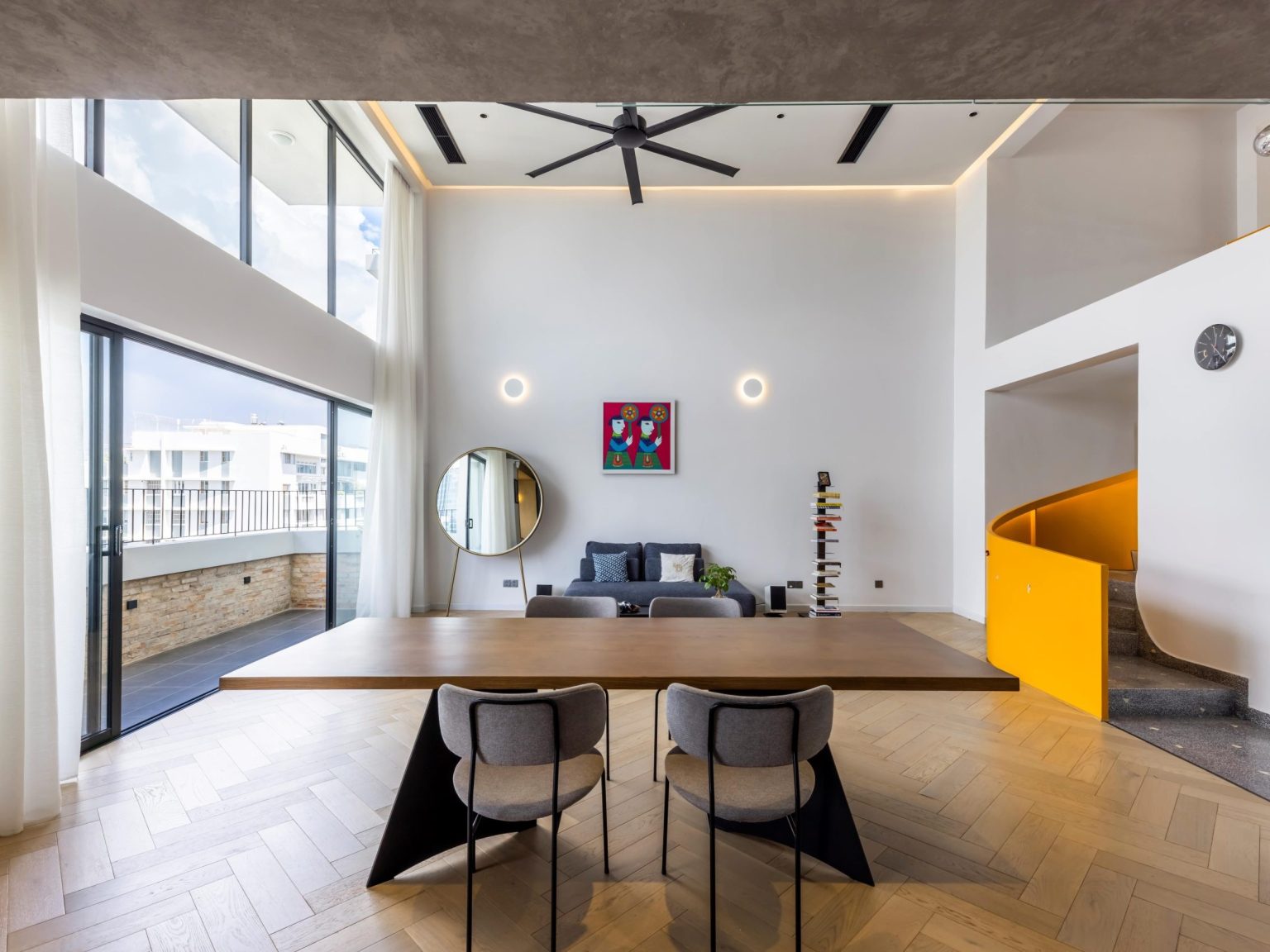 Hệ cửa kính kích lớn mở rộng cao sát trần tăng sự liên kết với ban công bên ngoài, rèm voan trắng giúp linh hoạt điều tiết lượng ánh sáng tự nhiên phù hợp với căn phòng. Quạt trần cũng được sử dụng để duy trì không khí thoáng đãng thay vì máy lạnh.