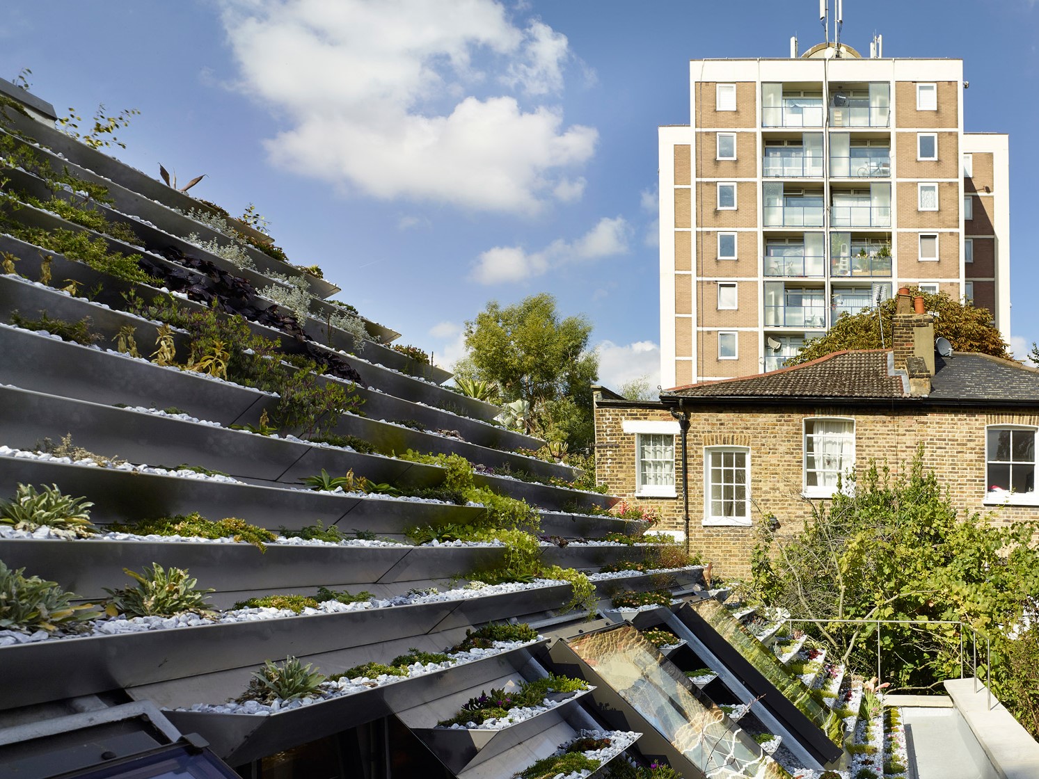 Garden House ở Anh từng gây ấn tượng truyền thông với vườn bậc thang trên mái nhà dốc tựa như kim tự tháp cây. Các loại cây được lựa chọn đều dễ chăm sóc, không cần tưới nhiều nước. Ảnh: Kilian O’Sulivan