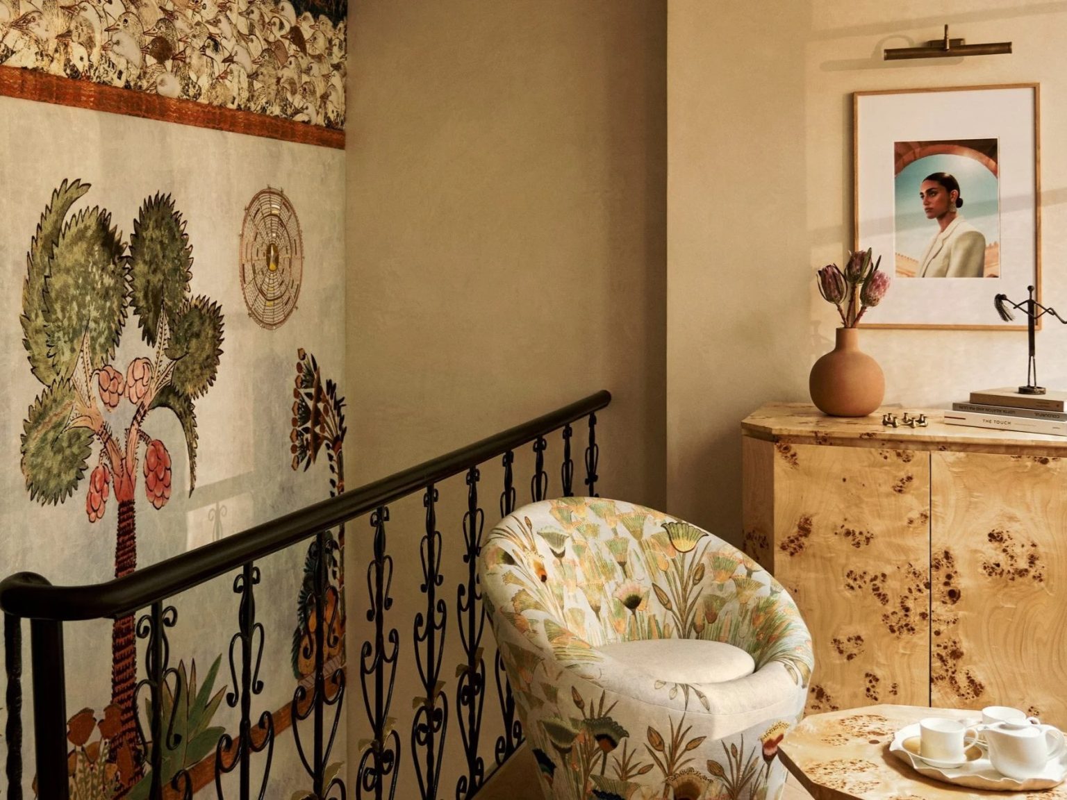 Dọc theo lối đi lên tầng, bức tường được bao phủ bởi tác phẩm trang trí tường do thương hiệu Bokja từ Beirut sáng tạo. Thiết kế mô phỏng thiên nhiên một cách tinh xảo, lấy cảm hứng từ những ngôi đền và lăng mộ Ai Cập cổ đại với hình ảnh hoa sen, hoa cói, cây cọ và ngỗng bay. Để tạo nên bức tranh sống động này, tấm vải đã trải qua quy trình chế tác tỉ mỉ với các công đoạn in và thêu theo kỹ thuật Aghabani truyền thống của Syria.