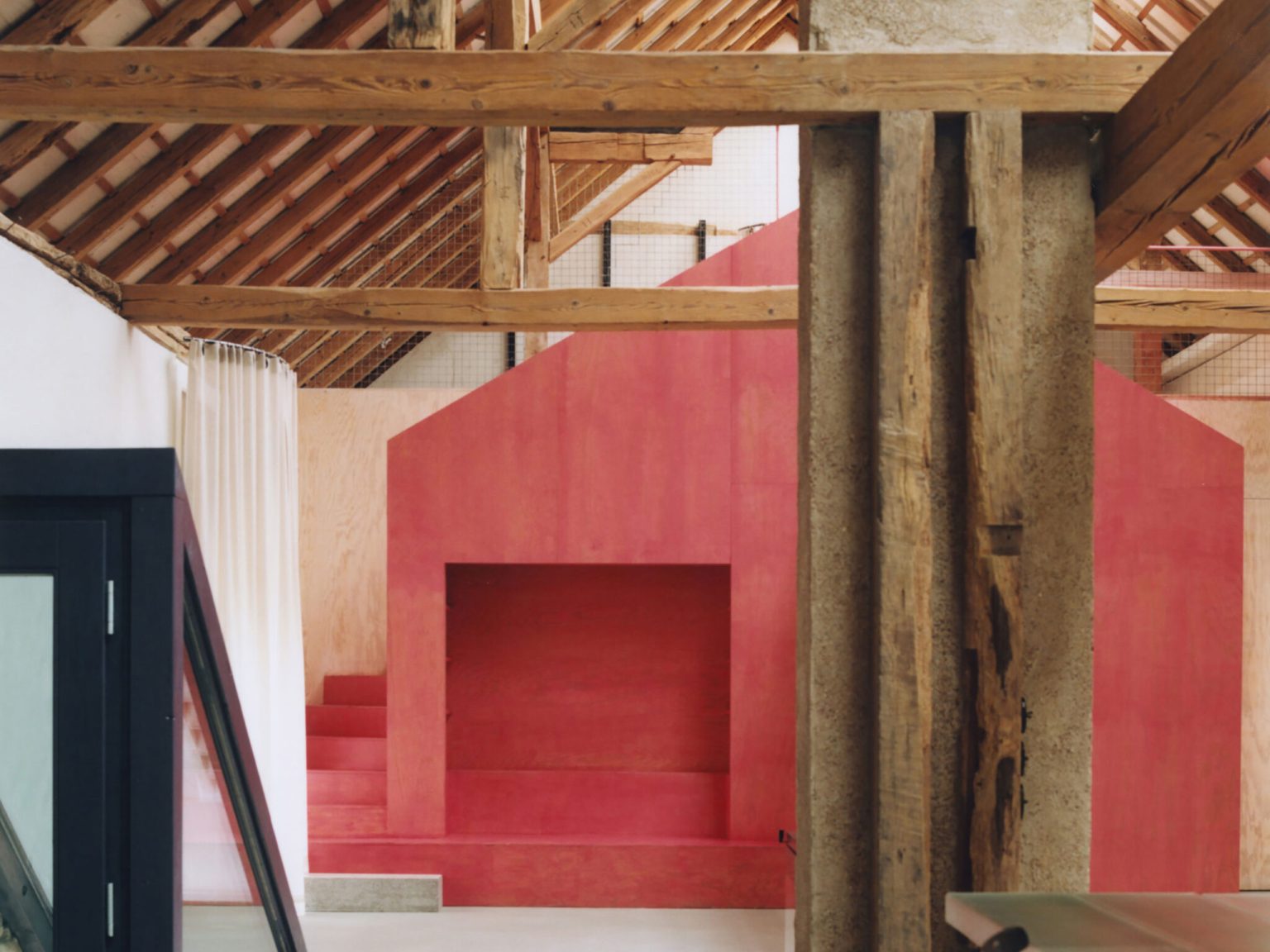 Đặc điểm nổi bật nhất của nhà kho là mặt bằng hình chữ L, trước đây được sử dụng để trữ cỏ khô. Tại đây, các kiến trúc sư đã tạo ra các “ngôi nhà trong nhà”, được mã hóa màu riêng biệt: một lô gia màu vàng làm nhà kính, một nhà bếp màu xanh lá cây, một cầu thang màu đỏ nhạt, khoang phòng ngủ màu xanh cobalt và một lối đi bằng kính màu hoa cà kết nối với sân trong. Các khu vực này giúp biến đổi không gian trong khi không tác động đến vì kèo.
