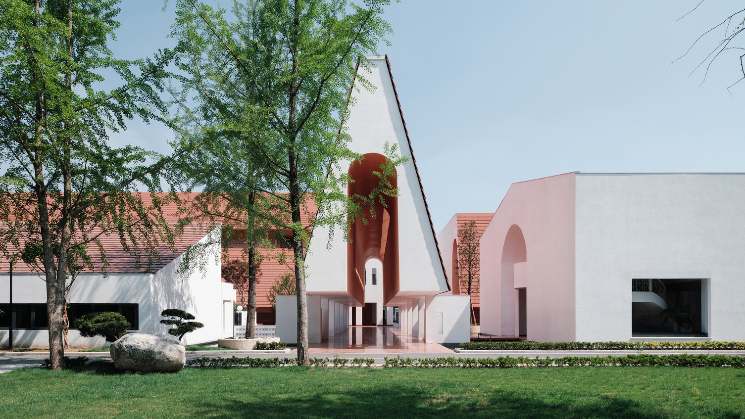 Ngói đất nung với màu sắc đặc trưng và độ bền vượt thời gian là vật liệu chủ đạo, bao phủ hệ mái dốc, tạo nên sắc đỏ chủ đạo toát lên sự ấm áp, gần gũi nhưng không kém phần đồ sộ cho tổng thể công trình giữa thiên nhiên xanh tốt.