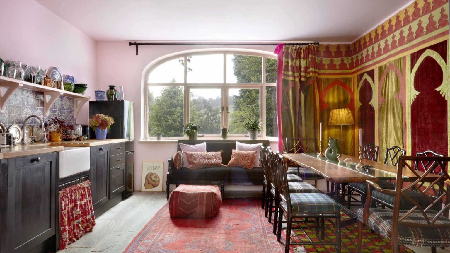 Điều đầu tiên nhà thiết kế trang sức Solange Azagury-Partridge làm sau khi chuyển đến ngôi nhà mang phong cách chiết trung tại Somerset là sơn toàn bộ cửa trước, tường và khung cửa sổ thành màu hồng. Cô chưa từng e ngại sử dụng các họa tiết hay sắc màu mạnh mẽ, và nhà bếp chính là minh chứng rõ nét cho phong cách của mình. Những bức tường hồng phấn kết hợp cùng hệ tủ bếp màu đen đã hiện đại hóa một không gian vốn mang đậm nét trung cổ với những món đồ vintage.