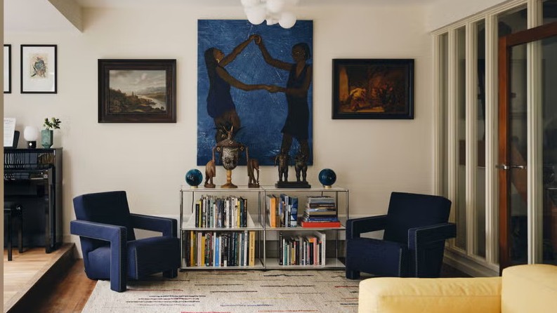 Tim cũng tỉ mỉ lựa chọn các vật liệu phù hợp với tinh thần Mid-Century cho tổ ấm, từ sàn gỗ bần, gạch ốp từng được sử dụng tại khu phức hợp Barbican, đến những tấm ốp tường gỗ ấm áp. Bộ sưu tập nghệ thuật mang sắc thái chiết trung của anh được bố trí nổi bật trên nền tường trắng tinh khôi, trong khi những tông màu đậm được sử dụng tiết chế, chỉ xuất hiện tại phòng làm việc và các phòng ngủ – những không gian riêng tư được phép mang tính biểu cảm mạnh mẽ hơn.