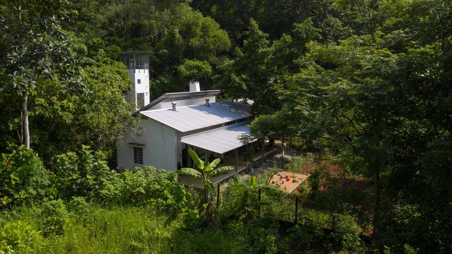 Trong thiên nhiên um tùm, các kiến trúc sư chọn kết cấu thép – mái lợp tôn – tường bao gạch xây. Một hướng xử lý gọn gàng, nhẹ nhàng hơn, giảm khối lượng vật liệu sử dụng. Công trình thấm thía tinh thần “chạm nhẹ vào đất” mà Glenn Murcutt – kiến trúc sư Úc đầu tiên được trao tặng giải Pritzker năm 2002, thường nhắc tới.