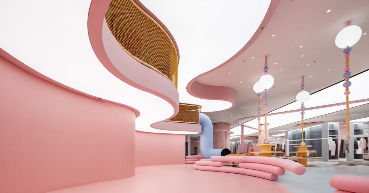 Khu vực bán đồ trẻ em tích hợp trực tiếp các yếu tố vui chơi, với kết cấu dễ leo trèo. Những chi tiết này mở rộng tinh thần vui tươi xuyên suốt cửa hàng, khéo léo lồng ghép các khoảnh khắc tương tác vào trải nghiệm mua sắm. Trần nhà dạng màng liền mạch thống nhất toàn bộ không gian, kiểm soát ánh sáng, làm mềm bóng đổ và nâng cao hiệu ứng trưng bày sản phẩm. Kết hợp với ánh sáng nhịp nhàng và bảng màu được sắp xếp tinh tế, hệ thống trân uốn lượn này duy trì sự rõ ràng về thị giác trong nội thất quy mô lớn.