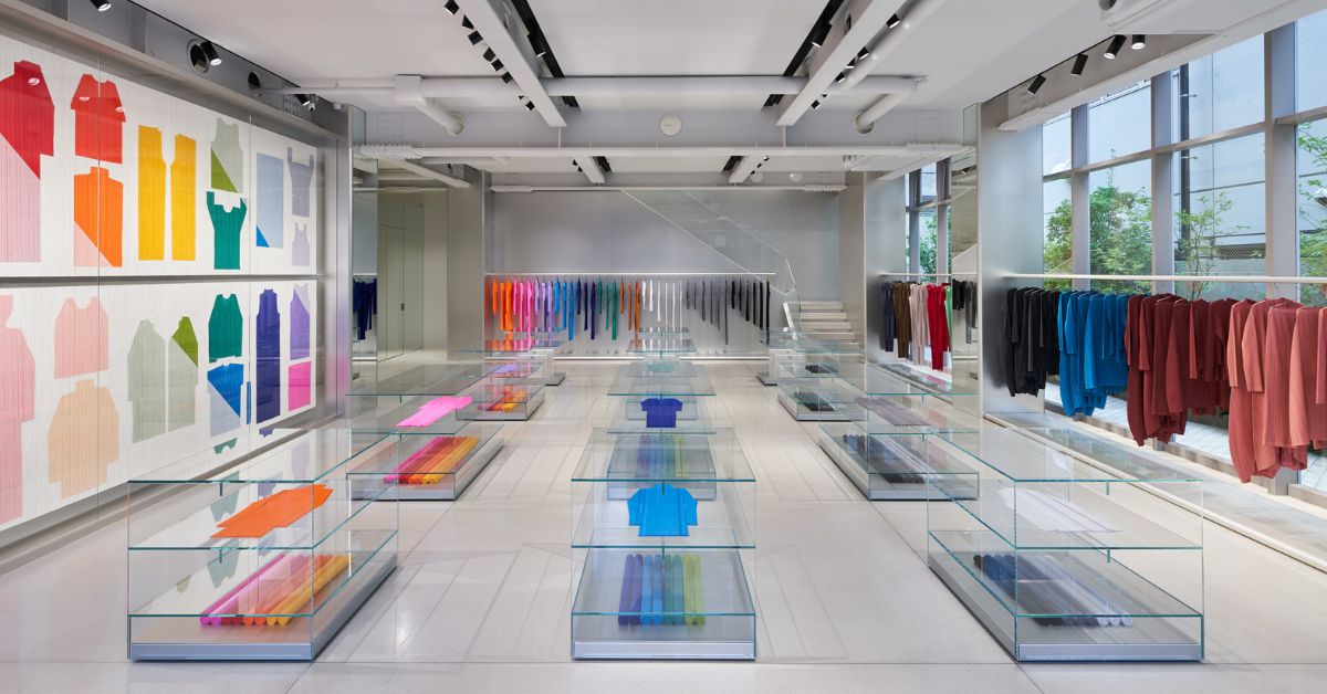 Cửa hàng PLEATS PLEASE ISSEY MIYAKE khai mở một không gian kiến trúc thuần khiết, nơi những đường nét thẳng thớm và ánh sáng được kiểm soát hoàn hảo cùng những nếp gấp đều đặn, trở thành hiện thân sống động cho triết lý về vẻ đẹp đề cao công năng.