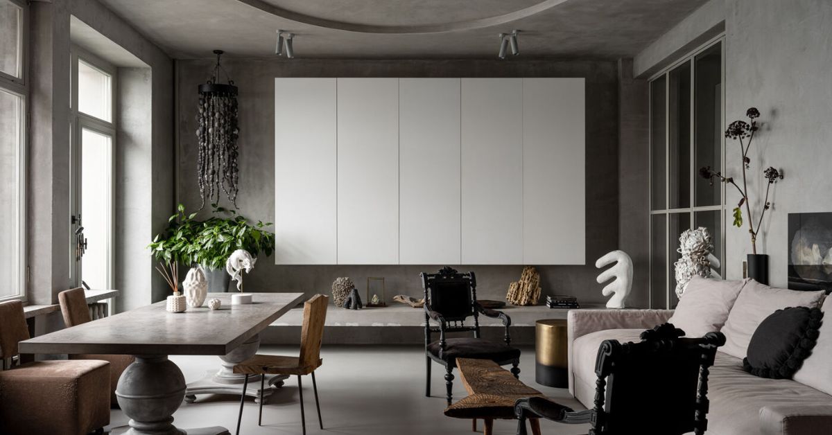 Toàn bộ không gian được định hình bằng những tương phản có chủ đích: khối gỗ thủ công của Denis Milovanov đặt cạnh bếp thép không gỉ; chất thô mộc của tường bê tông cân bằng với ánh sáng tự nhiên; sự đối lập giữa vật liệu tự nhiên và công nghiệp tạo cảm giác vừa mạnh mẽ vừa trầm tĩnh, phản chiếu tính cách của chính chủ nhân căn hộ.