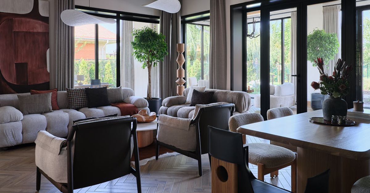 Bước vào phòng khách chính, điểm chạm đầu tiên là sự ôm ấp của những vật liệu tự nhiên. Trần nhà phô diễn hệ dầm gỗ sồi thô mộc, tường phủ lớp ốp gỗ ấm áp với sắc màu mật ong, tương hợp với đồ nội thất bọc vải linen nhăn mềm mại cùng da thuộm êm ái. Đèn thả lơ lửng tựa mây trôi, cùng sắc đổ thắm của bức tranh màu đất nung tạo nên nhịp đập cảm xúc tươi mới cho cả không gian.