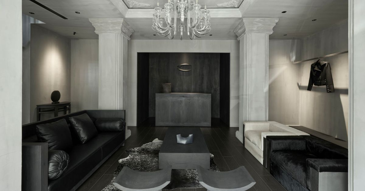 Trong không gian rộng 120m2, bê tông thô là phông nền chủ đạo, trong khi các chi tiết mang cảm hứng Gothic được tối giản hóa tinh tế từ chính logo thương hiệu.