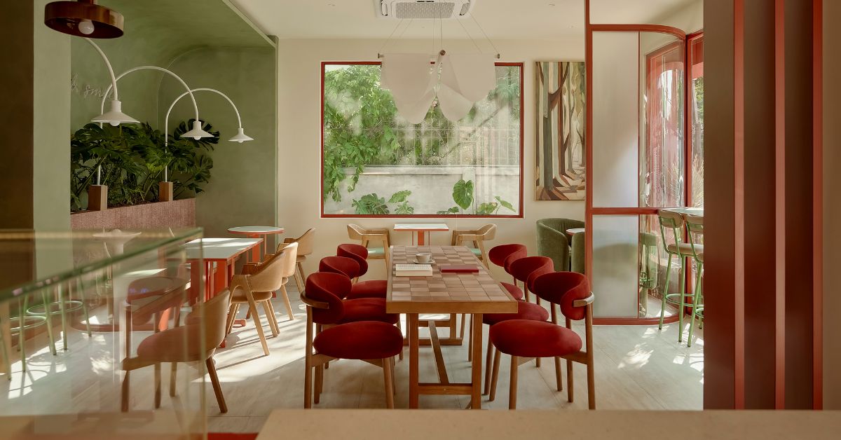 Ánh sáng tự nhiên từ các ô cửa kính lớn được điều tiết qua tông xám xanh của tường và mảng xanh cây cảnh. Tông đỏ trầm xuất hiện ở nhiều vị trí như tường, chân ghế và các chi tiết trang trí, góp phần tạo cảm giác gần gũi và thư giãn cho không gian.