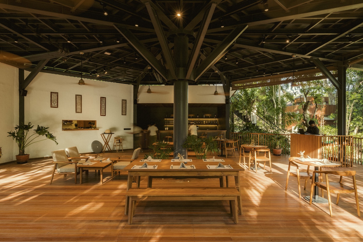 Trong khung cảnh các loài cây nhiệt đới, đồ nội thất thô và sàn bằng gỗ mang lại một không khí an yên cho hành trình nghỉ dưỡng của du khách.