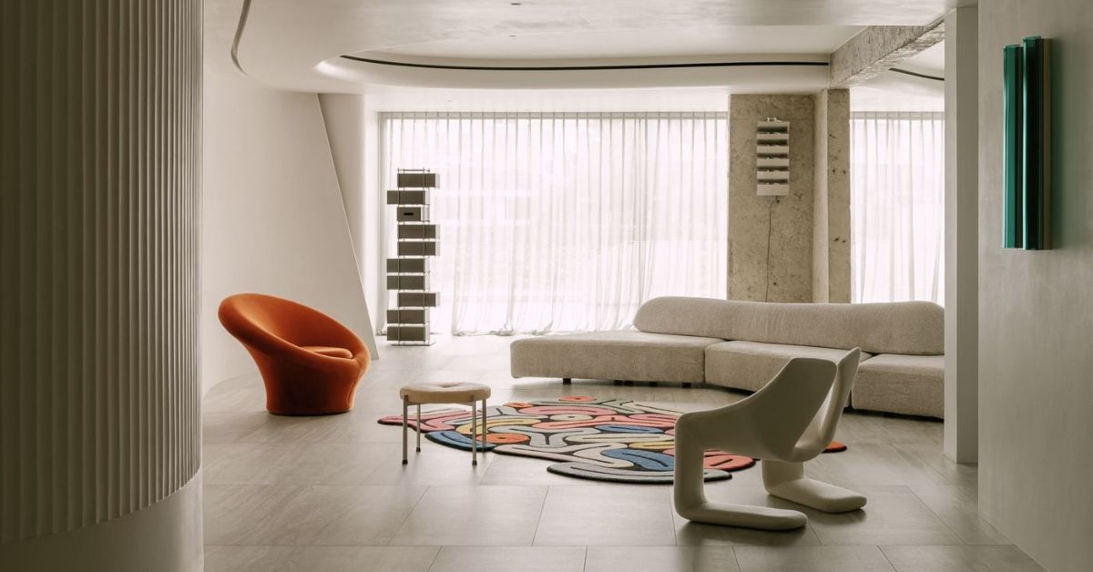 Không gian sinh hoạt mở, thoáng đãng. Nổi bật với hình dáng và màu sắc của chiếc armchair màu cam B&B Italia UP5 và bộ sofo uốn cong.