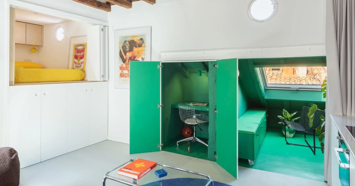 Phòng khách hoàn thiện với tông màu trung tính, tôn lên hệ thống dầm gỗ nguyên bản. Các không gian liền kề nằm sau những lớp vỏ đóng mở đa dạng, từ cánh cửa trượt ở phòng tắm, cửa gập khép kín phòng ngủ, đến tấm rèm che chắn không gian áp mái cùng góc làm việc. Khi những lớp ngăn cách ấy được mở ra, sắc trắng chủ đạo bỗng tan biến, nhường chỗ cho một bản hòa sắc rực rỡ, gồm bức tường mosaic xanh lam tươi mát, bộ drap giường màu vàng tươi tắn và góc thư giãn màu xanh lá cây đầy sức sống dưới mái nhà.