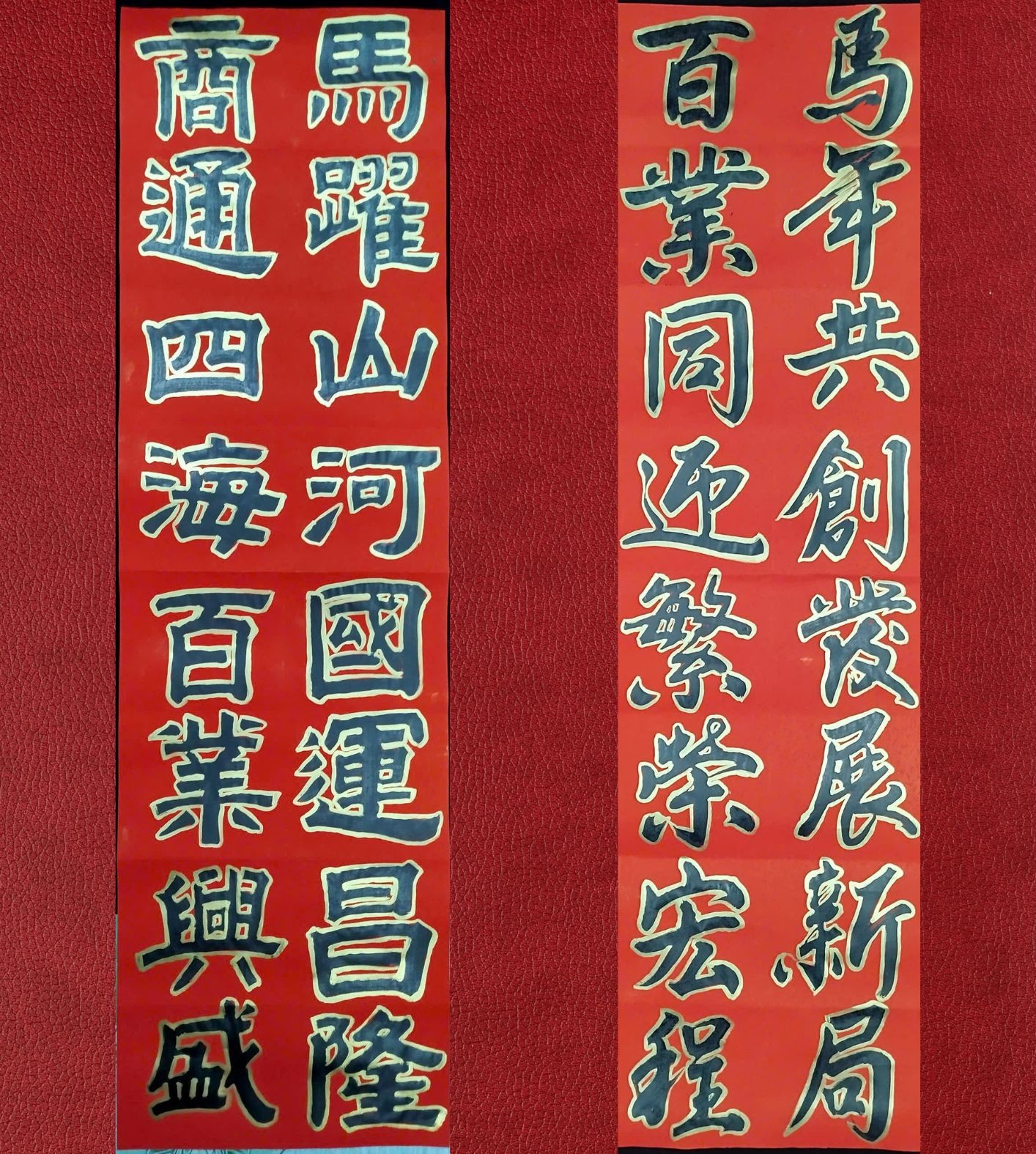 Mọi năm, Thái Trung đều viết nhiều câu đối để trưng bày tại sạp của mình, trong đó có cặp Liễn Tết Cát Tường: một bên cặp câu đôi cầu chúc cho Dân giàu nước mạnh – thế giới hòa bình – đại cuộc an vui; một bên cầu chúc cho Trăm nghề muôn nghiệp – kinh tế hưng thịnh – ấm no hạnh phúc. Cho Tết Bính Ngọ 2026, anh có hai cặp câu. Câu đối bên trái, được viết theo thể loại lệ thư: Mã dược sơn hà quốc vận xương long – Thương thông tứ hải bách nghiệp hưng thịnh (Ý nghĩa: Ngựa phi non nước, quốc vận hưng long-Thương thông bốn bể, trăm nghề thịnh vượng). Câu đối bên trái, được viết theo thể loại hành thư: Mã niên cộng sáng phát triển tân cục – Bách nghiệp đồng nghênh phồn vinh hoành trình (Ý nghĩa: Năm Ngựa chung tay xây cục mới- Trăm nghề đồng sức đón đường vinh). Ảnh: Thái Trung