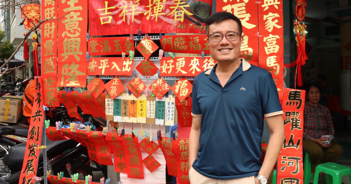 Vào những ngày cuối năm tại TP HCM, khi không khí Tết bắt đầu tràn ngập phố phường, tại góc ngã ba đường Trần Quý – Dương Tử Giang (Quận 11 cũ), có một người đang tịnh tâm gửi gắm những tâm tư an lành vào từng nét chữ tại sạp viết liễn quen thuộc. Thái Trung, tên thật là Triệu Trung, không chỉ là một thư pháp gia với 21 năm cầm bút, mà còn là nhà văn, nhà thơ, hoạ sĩ, giáo viên dạy học Tiếng Trung, tiếng Tiều, tiếng Quảng, thư pháp và hội họa. Ở tuổi 41, anh đã gặt hái nhiều thành tựu đáng tự hào như Giải Nhất cuộc thi Thư Pháp năm 2010, giải Xuất sắc cuộc thi viết văn do Báo SGGP Hoa Văn tổ chức năm 2006, đồng thời là hội viên và ủy viên của 10 hiệp hội văn hóa trong nước và quốc tế. Ngoài ra, các tác phẩm của anh từng được đăng trên các tạp chí văn nghệ trong nước và quốc tế như Singapore, Trung Quốc, Đài Loan, Australia…