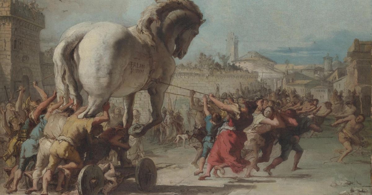 Người thành Troy trong giờ phút cận kề cửa tử hẳn đã phải hối hận tột cùng khi nhớ lại khoảnh khắc hân hoan kéo con ngựa gỗ ấy vào thành và phớt lờ đi lời cảnh báo: “Timeo Danaos et dona ferentis” (Ta sợ người Hy Lạp, ngay cả khi họ mang quà tặng). Con ngựa trong tác phẩm The Procession of the Trojan Horse in Troy (1773) của Giovanni Domenico Tiepolo. Con ngựa hiện lên với kích thước vĩ đại, chiếm vị thế độc tôn, đối lập gay gắt với tầng tầng lớp lớp con người nhỏ bé chen chúc phía dưới cùng,  quanh khung tranh. Gương mặt ngựa mang nét cười ma mãnh, ẩn chứa hiểm họa, một lần nữa tương phản với những ngũ quan mờ nhòe, thiếu cá tính của đám đông Troy. Những bức tường thành cao vút và không gian được tổ chức theo chiều sâu mạnh mẽ dẫn ánh nhìn về thành phố phía xa; ánh sáng tuy đầy đủ nhưng phủ sắc hoàng hôn u ám – như một lời tiên báo lặng lẽ cho sự sụp đổ không thể đảo ngược.
