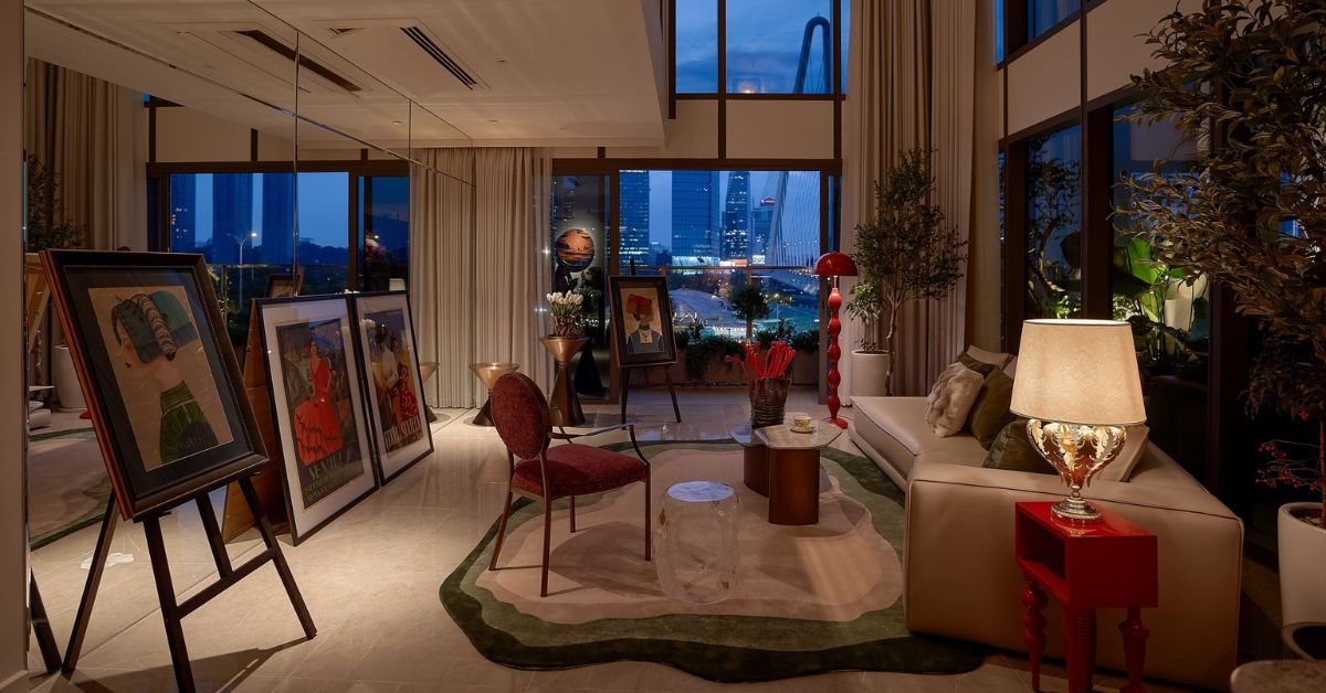 Khu vực phòng sinh hoạt chung và thông tầng căn hộ như một phòng trưng bày thu nhỏ tạo nên cảnh mở đầu đắt giá cho căn hộ.