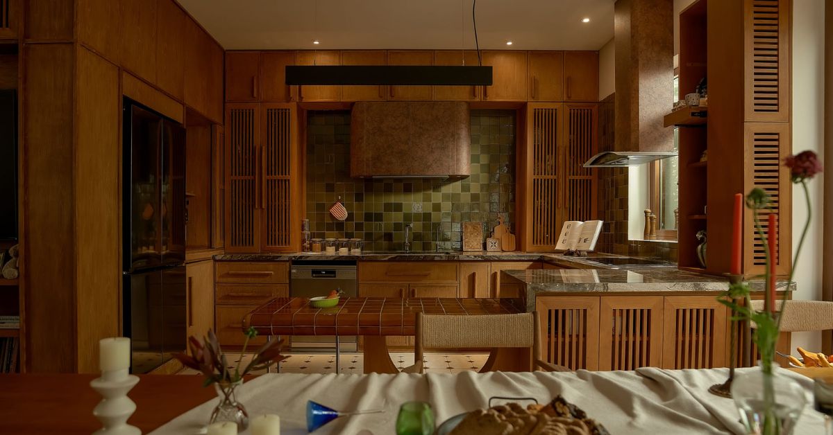 Tổng thể ngôi nhà HIRO House là không gian tổ chức vật liệu mang sắc thái hoài niệm nhưng không cũ kỹ. Hệ gỗ ấm được sử dụng xuyên suốt tạo cảm giác thống nhất và bao bọc, từ tủ bếp, cửa lùa nan đứng, kệ mở, đến những mảng ốp tường và đồ rời. Cách từng lớp gỗ được tiết chế để nhường chỗ cho gạch men thủ công một cách đúng lúc không chỉ hòa hợp mà còn tạo nên tầng sâu thị giác, lan tỏa cảm giác thân thuộc mà vẫn tạo điểm nhấn đúng chỗ.