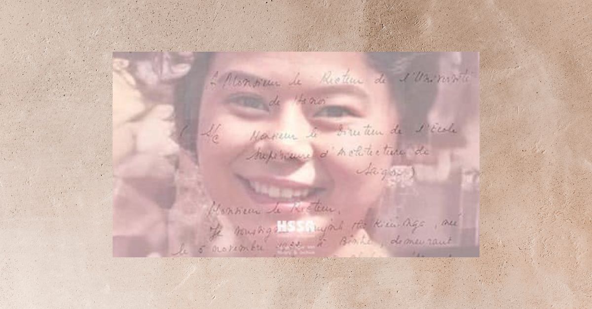 Kiến trúc sư Huỳnh Thị Kiều Nga tại Honolulu (ảnh từ album gia đình bà Yen Chi Pham) và thủ bút bà viết gửi giáo sư Jean Lassus, Hiệu trưởng Viện Đại học Hà Nội và Giáo sư Arthur Kruze, Giám đốc trường Cao đẳng Kiến trúc Sài Gòn năm 1953 xin học bổng theo học kiến trúc. Ảnh do tác giả sưu tầm, phục chế và biên khảo.