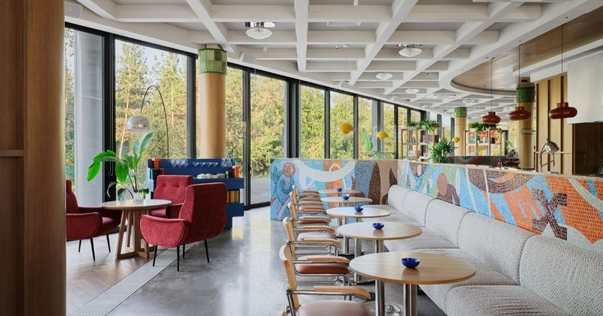 Bức mosaic hình thiên nga của nghệ sĩ Anastasia Zharko là một điểm nhấn quan trọng trong không gian. Ngay từ tên gọi, “Aqqu” trong tiếng Kazakh có nghĩa là “thiên nga trắng” – hình ảnh gắn với ký ức và nhận diện của công trình từ thập niên 1960. Trong nội thất, bức mosaic không chỉ đóng vai trò trang trí mà còn là cơ sở để xây dựng bảng màu tổng thể, với các tông xanh, vàng và burgundy được phát triển từ chính tác phẩm này. Việc sử dụng lại hình ảnh thiên nga vì vậy không chỉ mang tính nhận diện, mà còn đóng vai trò ý niệm cho toàn bộ dự án.