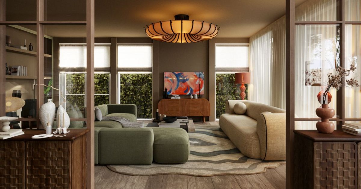 Lấy cảm hứng từ mùa thu Hà Nội, bảng màu nội thất dịu dàng với sắc vàng lá, nâu ấm và những mảng đen trầm như thân cây phố cũ. Gỗ hiện diện như một chất kết nối xuyên suốt, bao phủ sàn, trần và tường, tạo nên một lớp nền ấm áp mà con người có thể chạm vào mỗi ngày. Trên nền vật liệu liên tục ấy, đá xanh, gốm và tranh sơn mài xuất hiện như những mảnh ghép văn hóa thân thương, mang đến nhiều cung bậc cảm xúc qua từng bề mặt khác biệt.